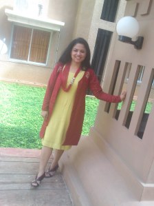 Layering helps to keep me warm and stylish for a chilly day in office , wearing a shift dress and a long woolen full sleeved overcoat. A lemony green/yellow shift dress in cotton silk , the long jacket is deep burgundy in wool blend .