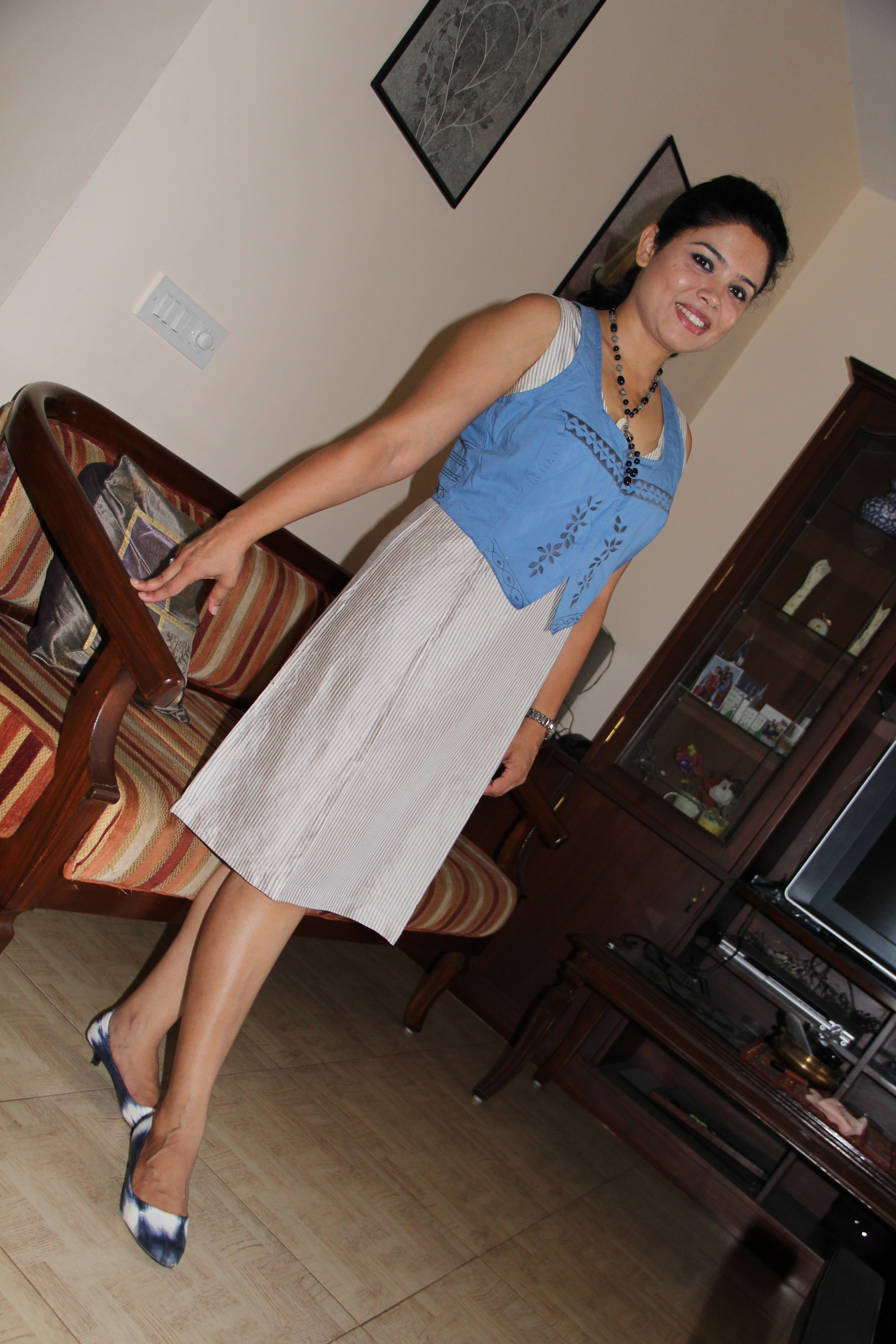 Playing with patterns – This time it is floral patterns on the vest with stripes on the dress, Stripes acts neutral and can help ground the floral pattern. In fact it can be the other way also… as they complement each other. Look for a unifying color and cut down the risk by choosing a bold shoe (As always I am risking it all by dual colored shoe 🙂 )..Try this –recycle an old dress and restyle your  wardrobe …do an Image Makeover for your wardrobe..