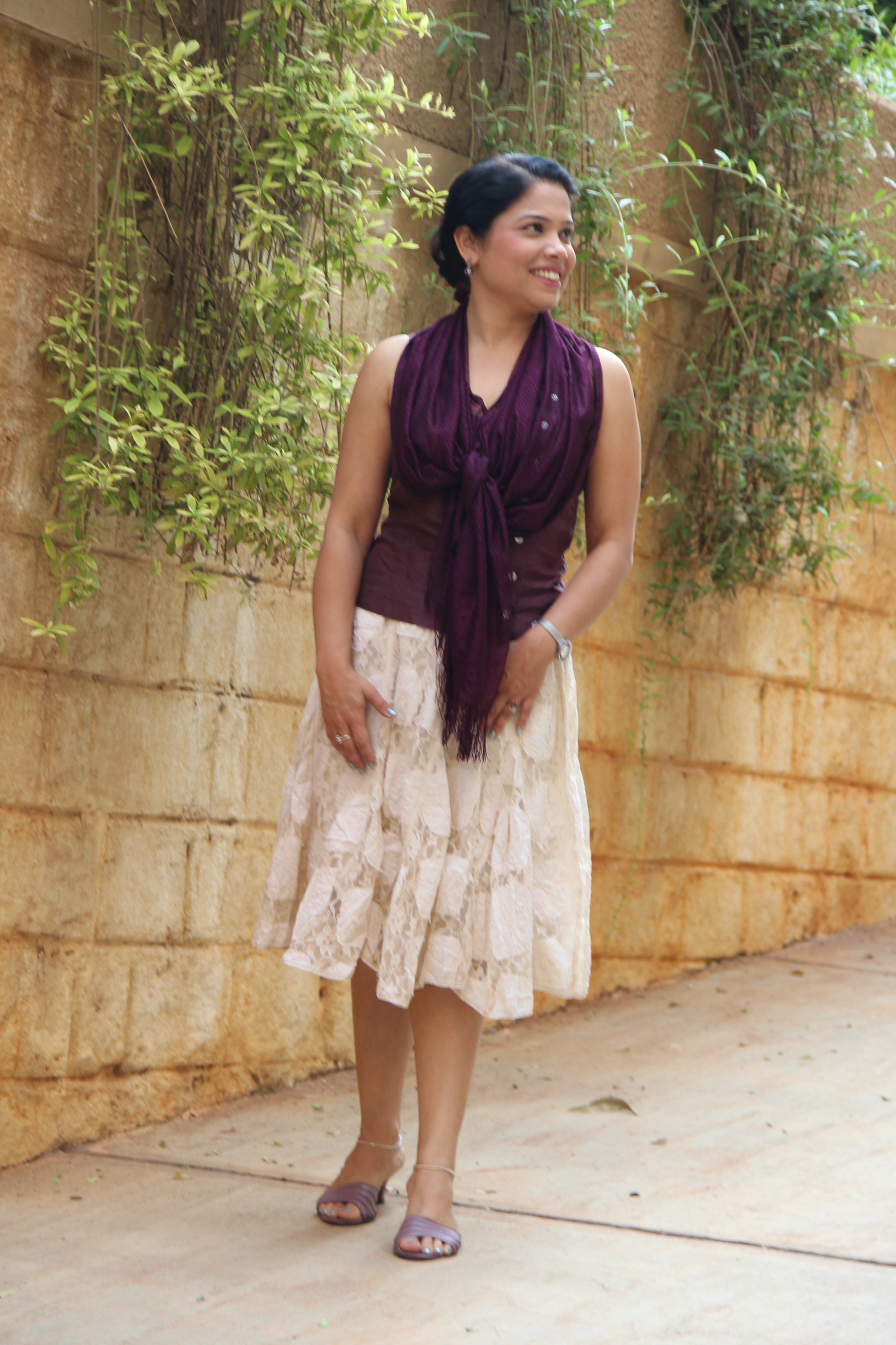 Feeling like I stepped out of an old British painting, my lace umbrella completed the dainty getup of a Vintage skirt , tailor fit top, and wine, net scarf. With my hair in a low bun of pinned up curls, I set out, not for a boat ride across the Thames, but a day of shopping ( with client ) in the merciless heat of Bangalore streets.